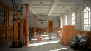 It was a brightly lit room with white-painted oak panelling and tile floors. The room was equipped with state-of-the-art exercise equipment, including two electric camels, an electric horse, a rowing machine, a punching bag, a weightlifting machine, and mechanical bicycles. All were very popular in the era.
